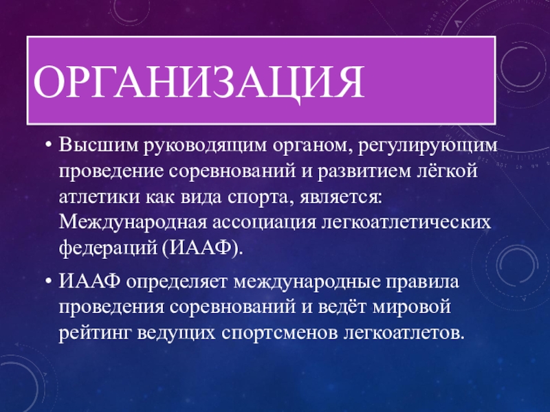 Высшим руководящим органом, регулирующим проведение соревнований и развитием лёгкой атлетики