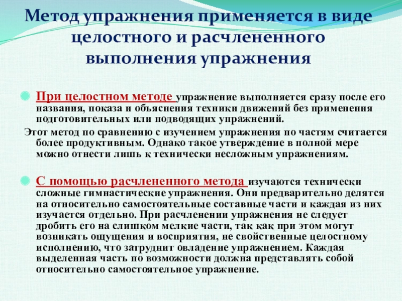 Слайд 23Метод упражнения применяется в виде целостного и расчлененного выполнения упражнения