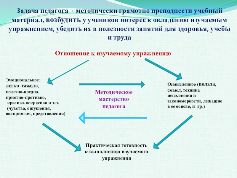 Задача педагога - методически грамотно преподнести учебный материал, возбудить у учеников интерес к овладению изучаемым упражнением, убедить их в полезности занятий для здоровья, учебы и труда