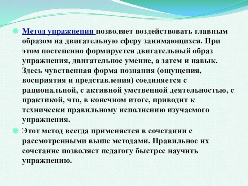 Слайд 22Метод упражнения позволяет воздействовать главным образом на двигательную сферу занимающихся. При
