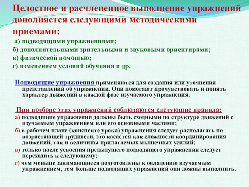 в) только после усвоения предыдущего подводящего упражнения следует переходить к следующему;