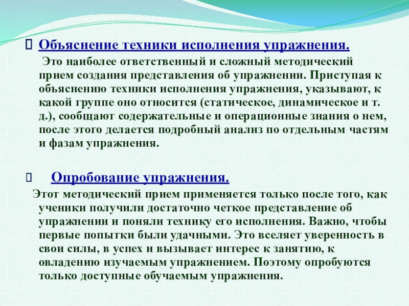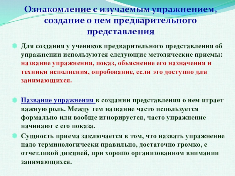 учеников предварительного представления об упражнении используются следующие методические приемы: название упражнения, показ, объяснение его назначения и техники исполнения, опробование, если это доступно для занимающихся.