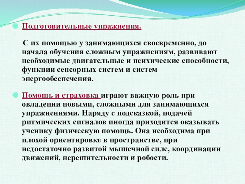 Помощь и страховка играют важную роль при овладении новыми, сложными для занимающихся упражнениями. Наряду с подсказкой, подачей ритмических сигналов иногда приходится оказывать ученику физическую помощь. Она необходима при плохой ориентировке в пространстве, при недостаточно развитой мышечной силе, координации движений, нерешительности и робости.