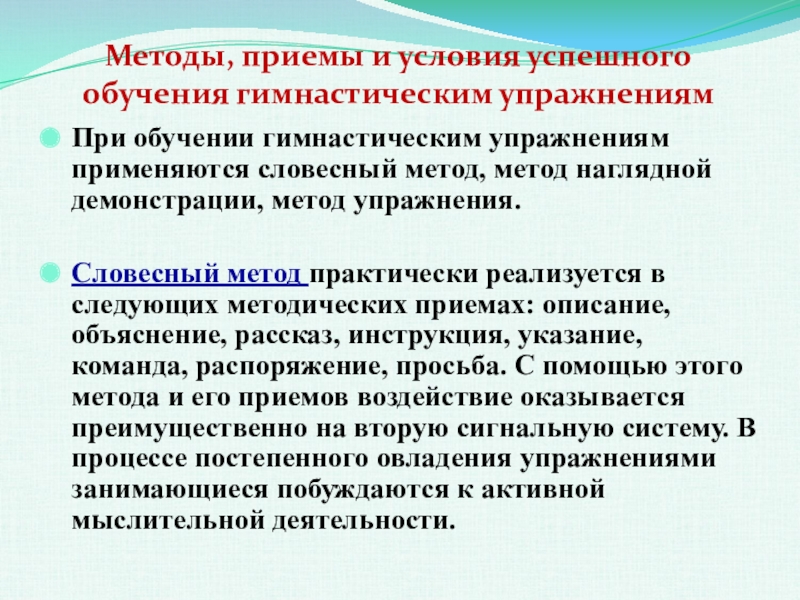 Словесный метод практически реализуется в следующих методических приемах: описание, объяснение, рассказ, инструкция, указание, команда, распоряжение, просьба. С помощью этого метода и его приемов воздействие оказывается преимущественно на вторую сигнальную систему. В процессе постепенного овладения упражнениями занимающиеся побуждаются к активной мыслительной деятельности.