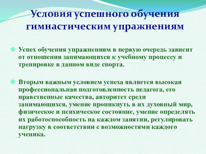 Слайд 26Условия успешного обучения гимнастическим упражнениям