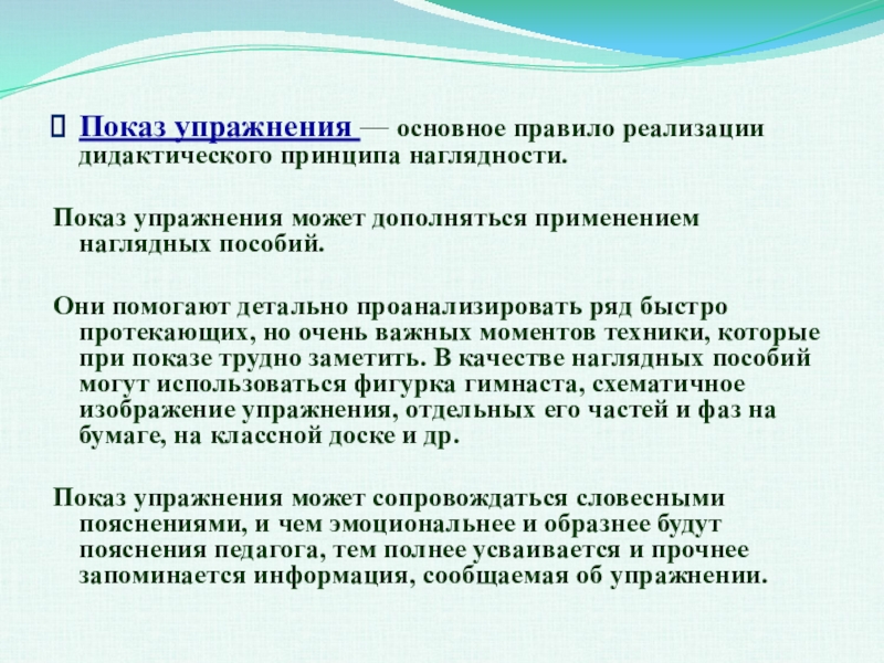 Показ упражнения — основное правило реализации дидактического принципа наглядности.