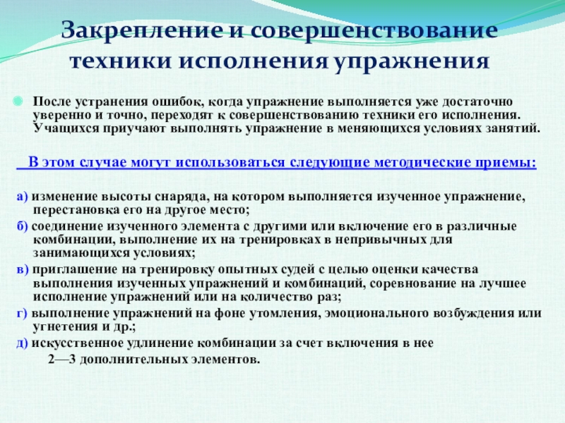 возможно большему числу параметров техники движений, устанавливается самоконтроль за движениями, устраняются ошибки в технике исполнения, совершенствуется культура движений, происходит овладение основами техники упражнения.