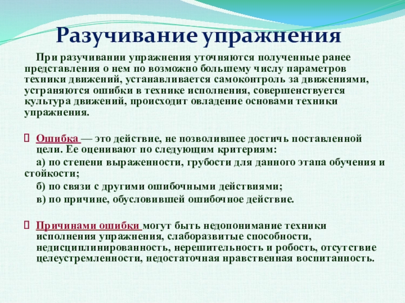 Причинами ошибки могут быть недопонимание техники исполнения упражнения, слаборазвитые способности, недисциплинированность, нерешительность и робость, отсутствие целеустремленности, недостаточная нравственная воспитанность.