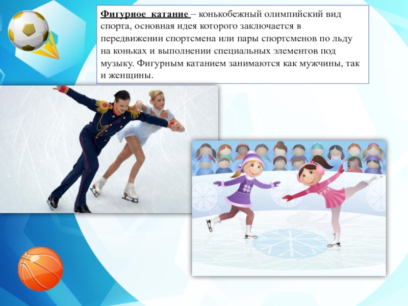 в передвижении спортсмена или пары спортсменов по льду на коньках и выполнении специальных элементов под музыку. Фигурным катанием занимаются как мужчины, так и женщины.