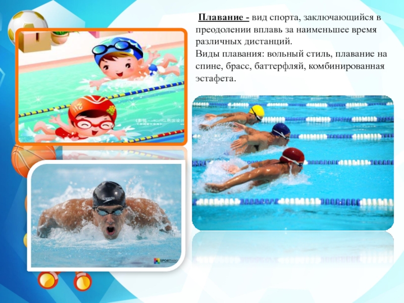 Слайд 11 Плавание - вид спорта, заключающийся в преодолении вплавь за наименьшее время