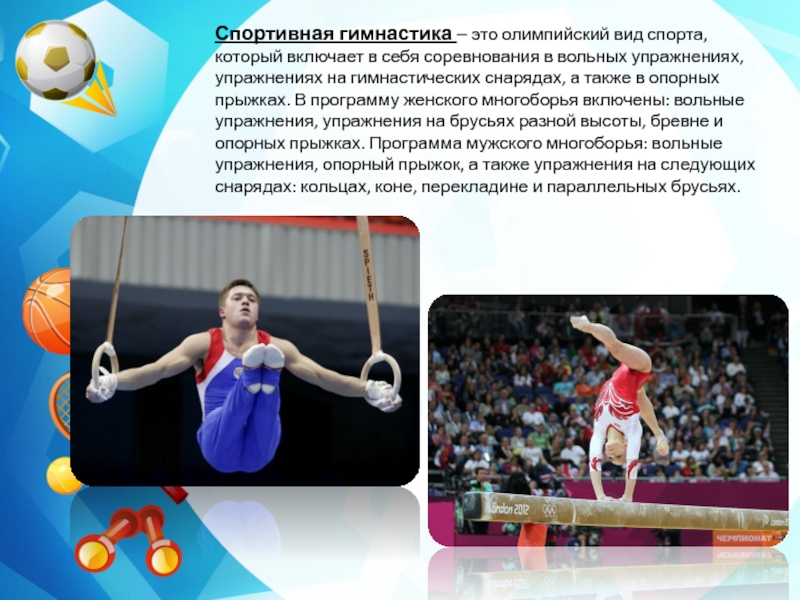 Слайд 10Спортивная гимнастика – это олимпийский вид спорта, который включает в себя