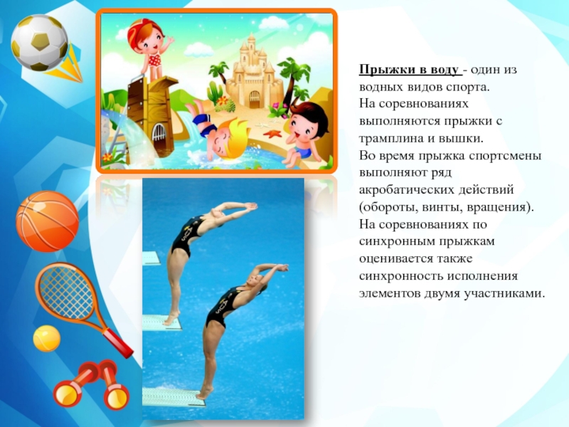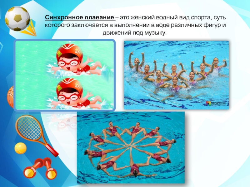 Слайд 13Синхронное плавание – это женский водный вид спорта, суть которого заключается