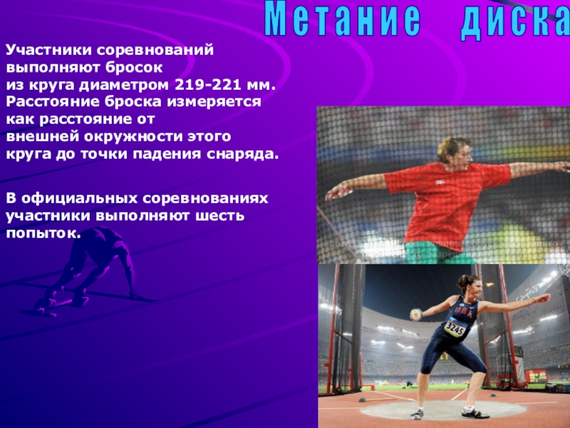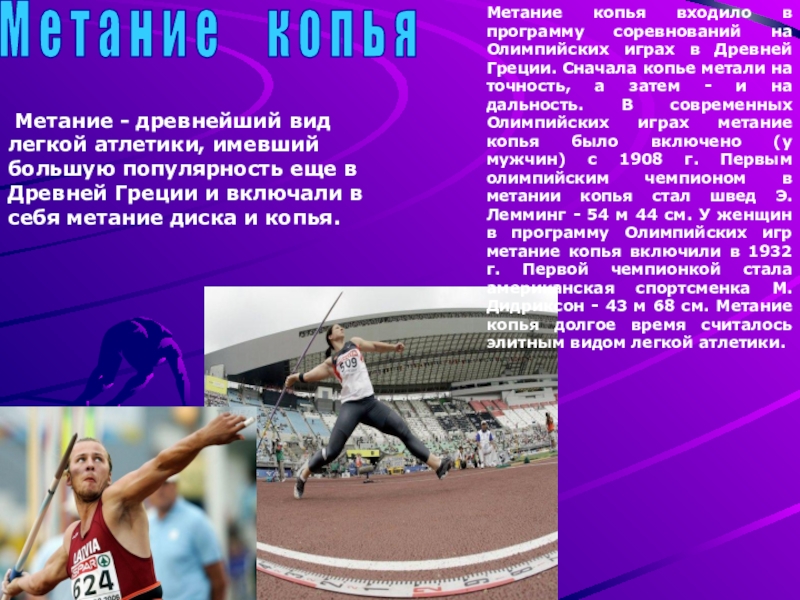 Метание - древнейший вид легкой атлетики, имевший большую популярность еще в Древней Греции и включали в себя метание диска и копья.