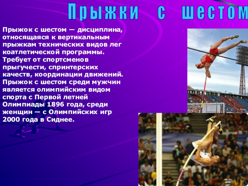 Прыжок с шестом — дисциплина, относящаяся к вертикальным прыжкам технических видов легкоатлетической программы. Требует от спортсменов прыгучести, спринтерских качеств, координации движений. Прыжок с шестом среди мужчин является олимпийским видом спорта с Первой летней Олимпиады 1896 года, среди женщин — с Олимпийских игр 2000 года в Сиднее.