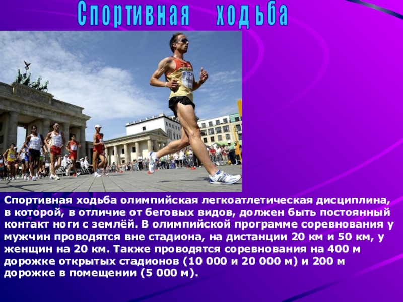 Спортивная ходьба олимпийская легкоатлетическая дисциплина, в которой, в отличие от беговых видов, должен быть постоянный контакт ноги с землёй. В олимпийской программе соревнования у мужчин проводятся вне стадиона, на дистанции 20 км и 50 км, у женщин на 20 км. Также проводятся соревнования на 400 м дорожке открытых стадионов (10 000 и 20 000 м) и 200 м дорожке в помещении (5 000 м).