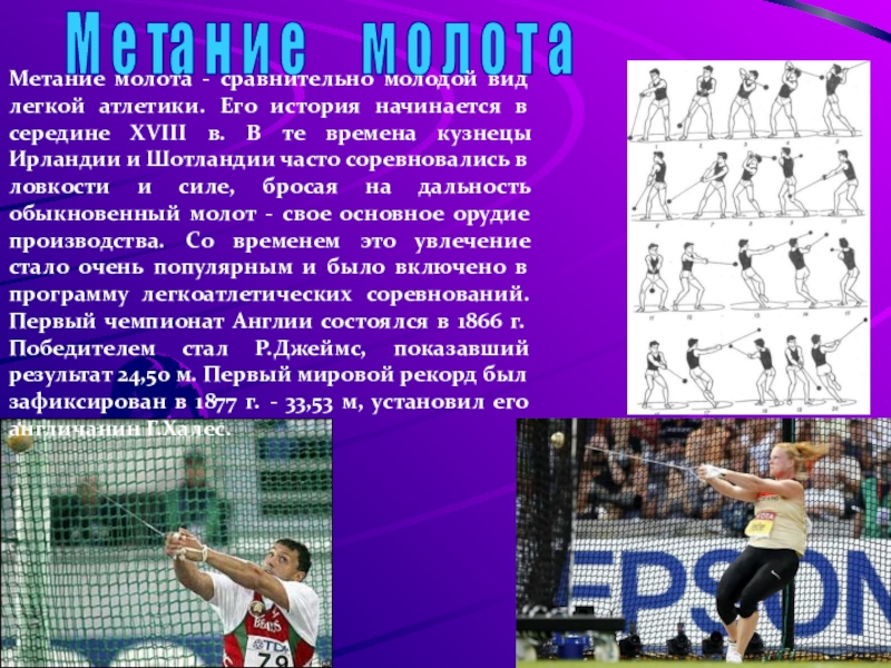 Метание молота - сравнительно молодой вид легкой атлетики. Его история начинается в середине XVIII в. В те времена кузнецы Ирландии и Шотландии часто соревновались в ловкости и силе, бросая на дальность обыкновенный молот - свое основное орудие производства. Со временем это увлечение стало очень популярным и было включено в программу легкоатлетических соревнований. Первый чемпионат Англии состоялся в 1866 г. Победителем стал Р.Джеймс, показавший результат 24,50 м. Первый мировой рекорд был зафиксирован в 1877 г. - 33,53 м, установил его англичанин Г.Халес.