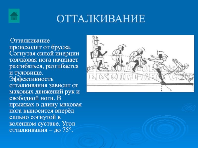 нога начинает разгибаться, разгибается и туловище. Эффективность отталкивания зависит от маховых движений рук и свободной ноги. В прыжках в длину маховая нога выносится вперёд сильно согнутой в коленном суставе. Угол отталкивания – до 75°.