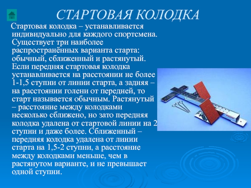 СТАРТОВАЯ КОЛОДКА   Стартовая колодка – устанавливается индивидуально для каждого спортсмена. Существует три наиболее распространённых варианта