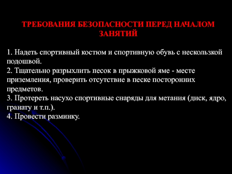 ТРЕБОВАНИЯ БЕЗОПАСНОСТИ ПЕРЕД НАЧАЛОМ ЗАНЯТИЙ1. Надеть спортивный костюм и спортивную обувь с нескользкой подошвой.2. Тщательно разрыхлить песок
