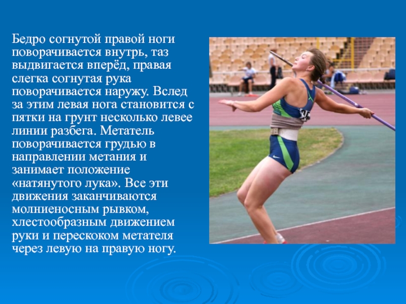 согнутая рука поворачивается наружу. Вслед за этим левая нога становится с пятки на грунт несколько левее линии разбега. Метатель поворачивается грудью в направлении метания и занимает положение «натянутого лука». Все эти движения заканчиваются молниеносным рывком, хлестообразным движением руки и перескоком метателя через левую на правую ногу.
