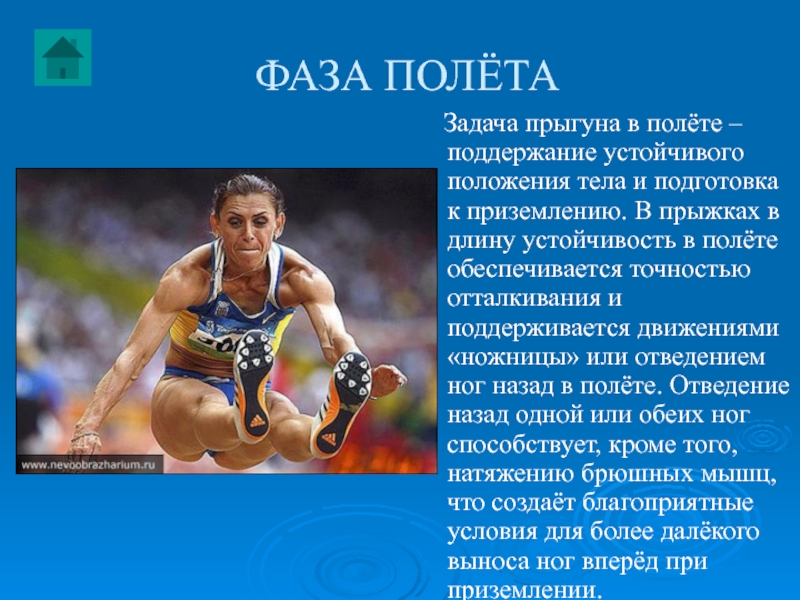 ФАЗА ПОЛЁТА  Задача прыгуна в полёте – поддержание устойчивого положения тела и подготовка к приземлению. В