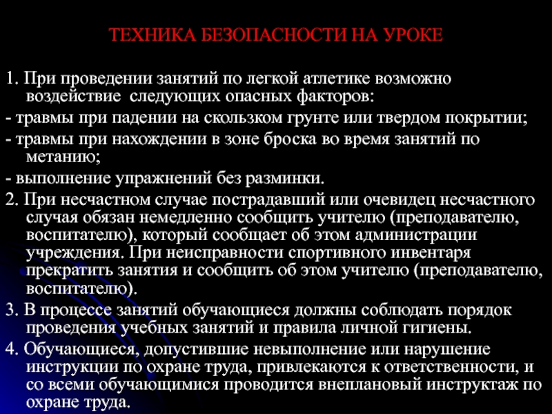 ТЕХНИКА БЕЗОПАСНОСТИ НА УРОКЕ1. При проведении занятий по легкой атлетике возможно воздействие следующих опасных факторов:- травмы при