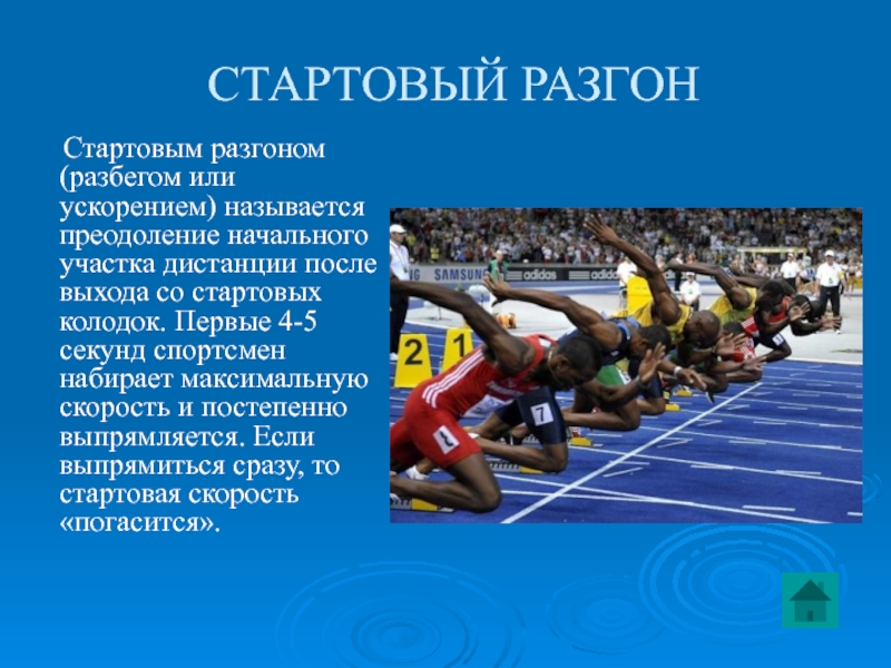 начального участка дистанции после выхода со стартовых колодок. Первые 4-5 секунд спортсмен набирает максимальную скорость и постепенно выпрямляется. Если выпрямиться сразу, то стартовая скорость «погасится».