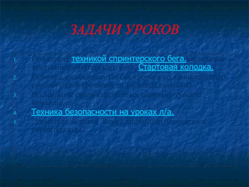 ЗАДАЧИ УРОКОВОвладение техникой спринтерского бега.Овладение техникой спринтерского бега. Стартовая колодка.Развитие выносливости, быстроты и координационных способностей (реакция на