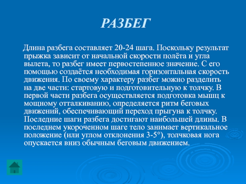 РАЗБЕГ  Длина разбега составляет 20-24 шага. Поскольку результат прыжка зависит от начальной скорости полёта и угла