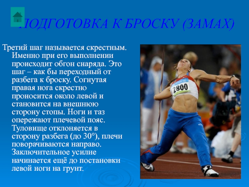 ПОДГОТОВКА К БРОСКУ (ЗАМАХ)Третий шаг называется скрестным. Именно при его выполнении происходит обгон снаряда. Это шаг –
