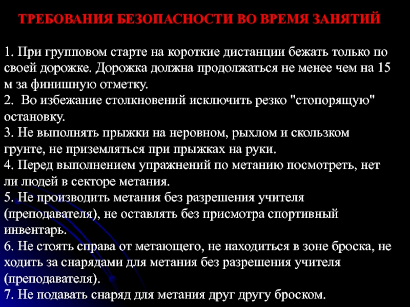 ТРЕБОВАНИЯ БЕЗОПАСНОСТИ ВО ВРЕМЯ ЗАНЯТИЙ1. При групповом старте на короткие дистанции бежать только по своей дорожке. Дорожка