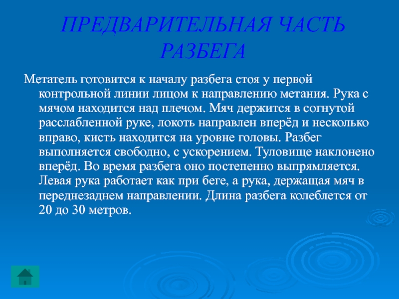 ПРЕДВАРИТЕЛЬНАЯ ЧАСТЬ РАЗБЕГАМетатель готовится к началу разбега стоя у первой контрольной линии лицом к направлению метания. Рука