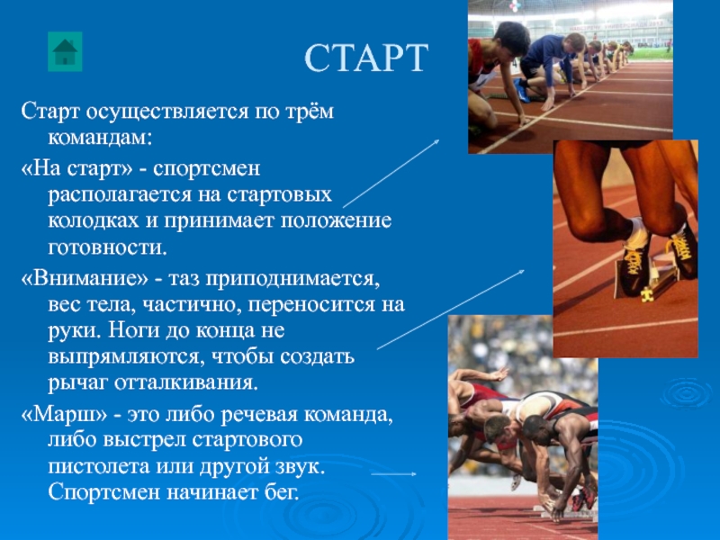 СТАРТСтарт осуществляется по трём командам:«На старт» - спортсмен располагается на стартовых колодках и принимает положение готовности.«Внимание» -
