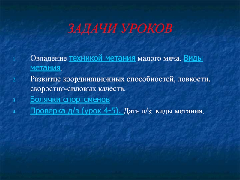 ЗАДАЧИ УРОКОВ Овладение техникой метания малого мяча. Виды метания.Развитие координационных способностей, ловкости, скоростно-силовых качеств.Болячки спортсменовПроверка д/з (урок
