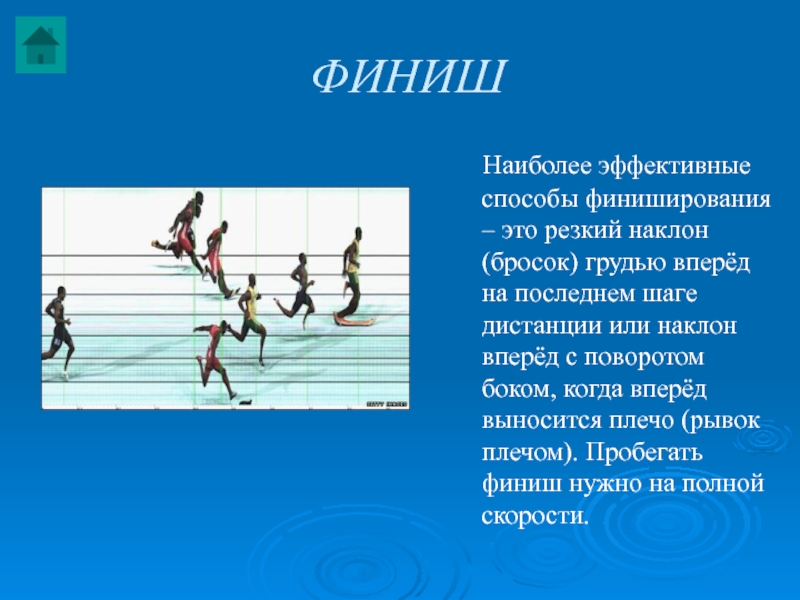 ФИНИШ  Наиболее эффективные способы финиширования – это резкий наклон (бросок) грудью вперёд на последнем шаге дистанции