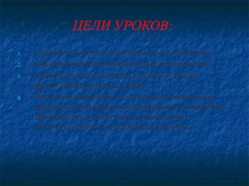 ЦЕЛИ УРОКОВ:Содействие нормальному физическому развитию.Обучение жизненно важным умениям и навыкам.Приобретение необходимых знаний в области физической культуры и спорта.Воспитание потребности и умения самостоятельно заниматься физическими упражнениями, сознательно применять их в целях отдыха, повышения работоспособности и укрепления здоровья.