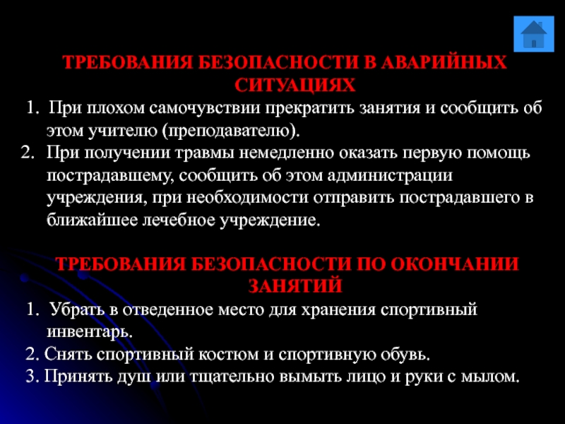 ТРЕБОВАНИЯ БЕЗОПАСНОСТИ В АВАРИЙНЫХ СИТУАЦИЯХ1. При плохом самочувствии прекратить занятия и сообщить об этом учителю (преподавателю).При получении