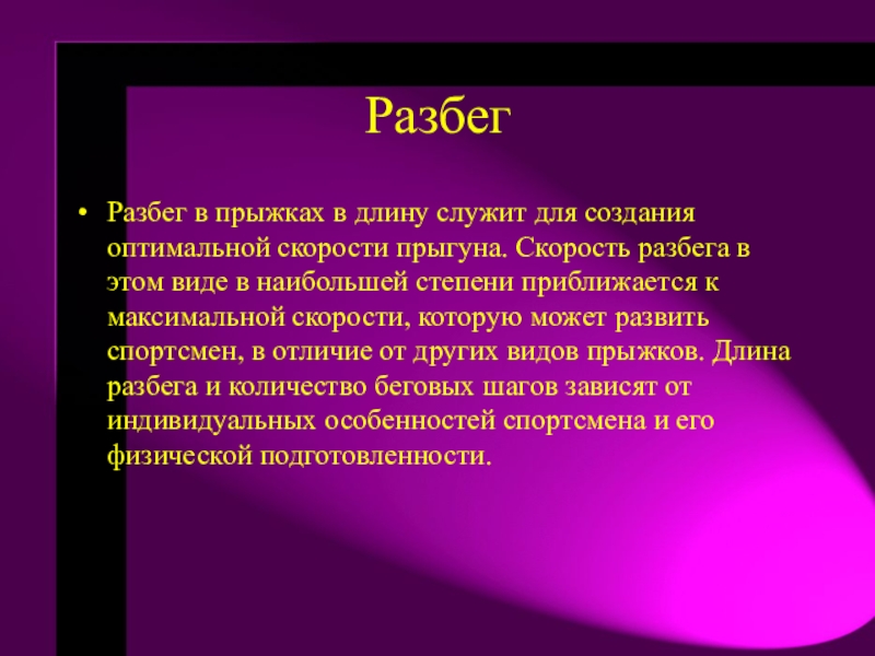 Разбег в прыжках в длину служит для создания оптимальной скорости прыгуна.