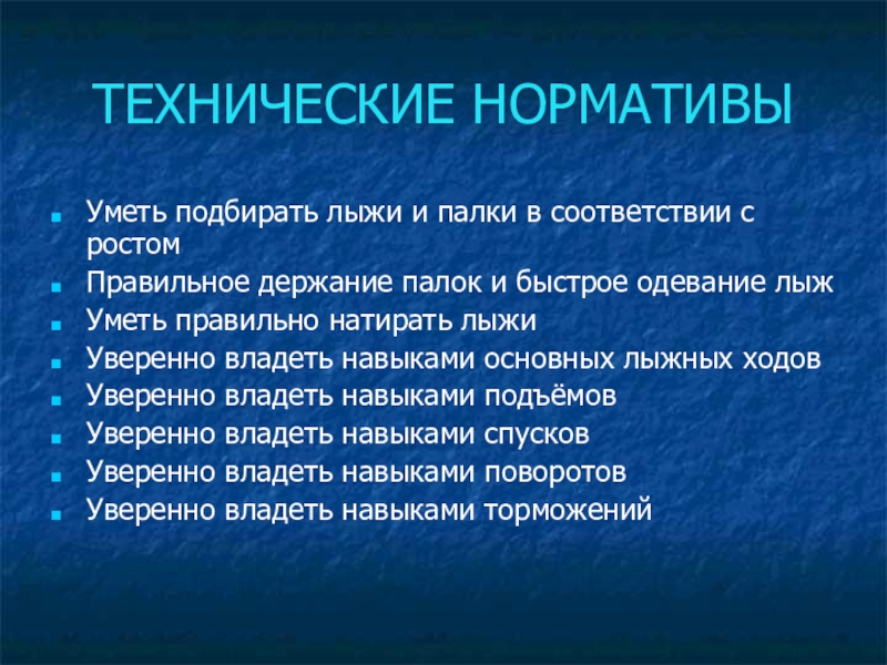 ТЕХНИЧЕСКИЕ НОРМАТИВЫУметь подбирать лыжи и палки в соответствии с ростомПравильное держание палок и быстрое одевание лыжУметь правильно