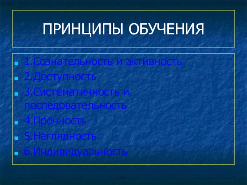 ПРИНЦИПЫ ОБУЧЕНИЯ1.Сознательность и активность2.Доступность3.Систематичность и последовательность4.Прочность5.Наглядность6.Индивидуальность