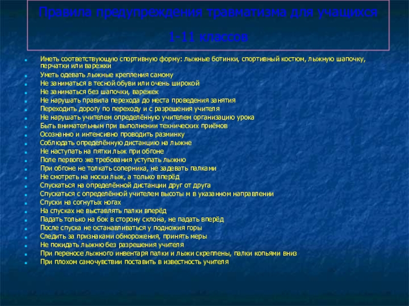 Правила предупреждения травматизма для учащихся 1-11 классов Иметь соответствующую спортивную форму: лыжные ботинки, спортивный костюм, лыжную шапочку,