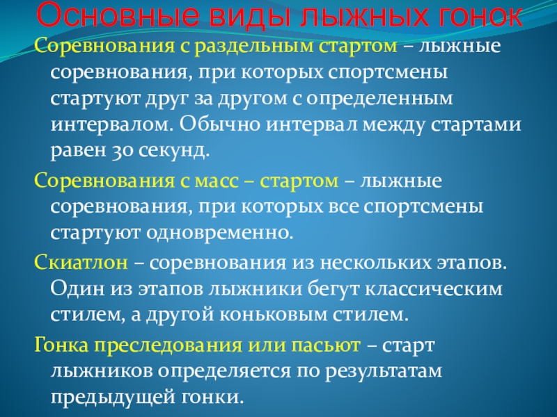 Соревнования с масс – стартом – лыжные соревнования, при которых все спортсмены стартуют одновременно.