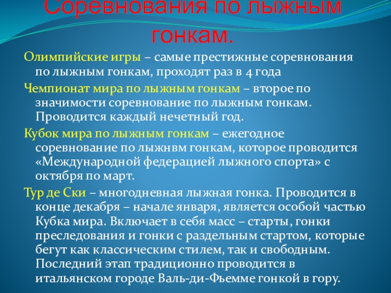 Тур де Ски – многодневная лыжная гонка. Проводится в конце декабря – начале января, является особой частью Кубка мира. Включает в себя масс – старты, гонки преследования и гонки с раздельным стартом, которые бегут как классическим стилем, так и свободным. Последний этап традиционно проводится в итальянском городе Валь-ди-Фьемме гонкой в гору.