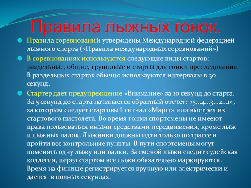Стартер дает предупреждение «Внимание» за 10 секунд до старта. За 5 секунд до старта начинается обратный отсчет: «5...4...3...2...1», за которым следует стартовый сигнал «Марш» или выстрел из стартового пистолета. Во время гонки спортсмены не имееют права пользоваться иными средствами передвижения, кроме лыж и лыжных палок. Лыжники должны идти только по трассе и пройти все контрольные пункты. В пути спортсмены могут поменять одну лыжу или палки. За сменой лыжи следит судейская коллегия, перед стартом все лыжи обязательно маркируются. Время на финише регистрируется вручную или электрически и дается в полных секундах.