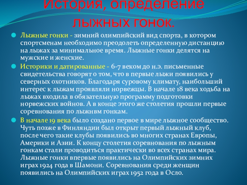 Историки и датированные - 6-7 веком до н.э. письменные свидетельства говорят о том, что в первые лыжи появились у северных охотников. Благодаря суровому климату, наибольший интерес к лыжам проявляли норвежцы. В начале 18 века ходьба на лыжах входила в обязательную программу подготовки норвежских войнов. А в конце этого же столетия прошли первые соревнования по лыжнвм гонкам.