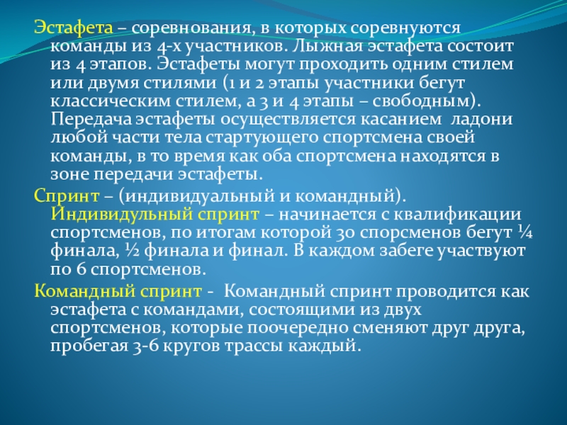 Слайд 9Эстафета – соревнования, в которых соревнуются команды из 4-х участников. Лыжная