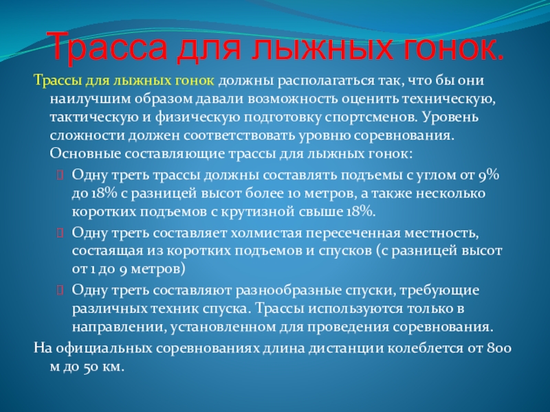 бы они наилучшим образом давали возможность оценить техническую, тактическую и физическую подготовку спортсменов. Уровень сложности должен соответствовать уровню соревнования. Основные составляющие трассы для лыжных гонок:
