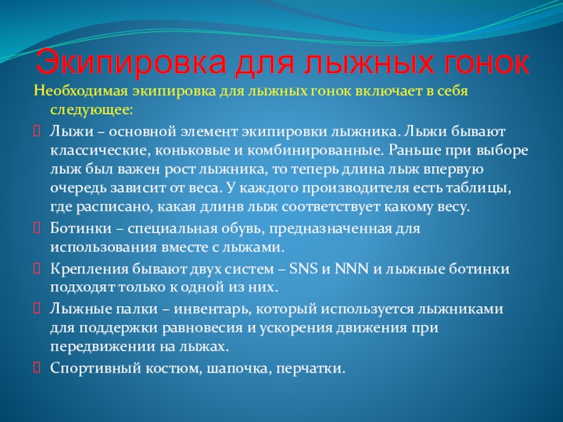 Лыжи – основной элемент экипировки лыжника. Лыжи бывают классические, коньковые и комбинированные. Раньше при выборе лыж был важен рост лыжника, то теперь длина лыж впервую очередь зависит от веса. У каждого производителя есть таблицы, где расписано, какая длинв лыж соответствует какому весу.