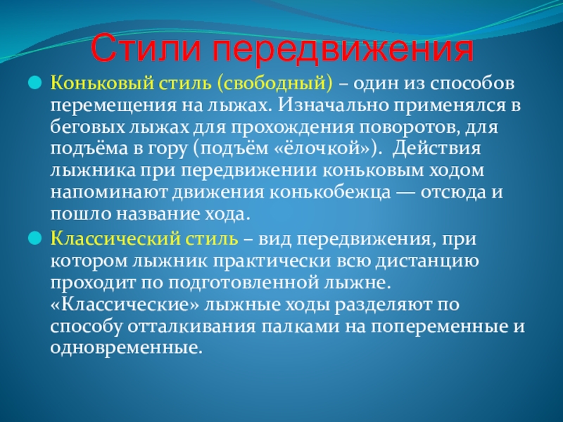 Классический стиль – вид передвижения, при котором лыжник практически всю дистанцию проходит по подготовленной лыжне. «Классические» лыжные ходы разделяют по способу отталкивания палками на попеременные и одновременные.