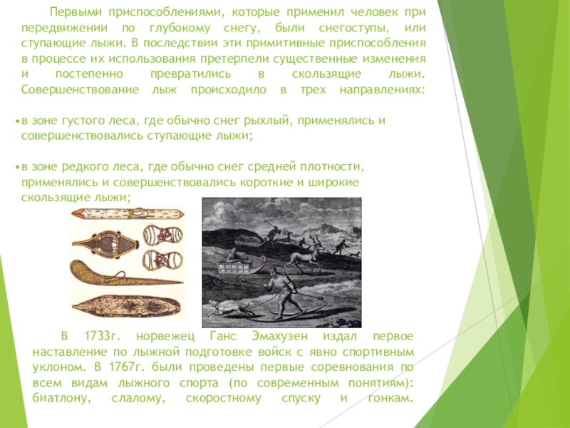Первыми приспособлениями, которые применил человек при передвижении по глубокому снегу, были снегоступы, или ступающие лыжи. В последствии эти примитивные приспособления в процессе их использования претерпели существенные изменения и постепенно превратились в скользящие лыжи. Совершенствование лыж происходило в трех направлениях: